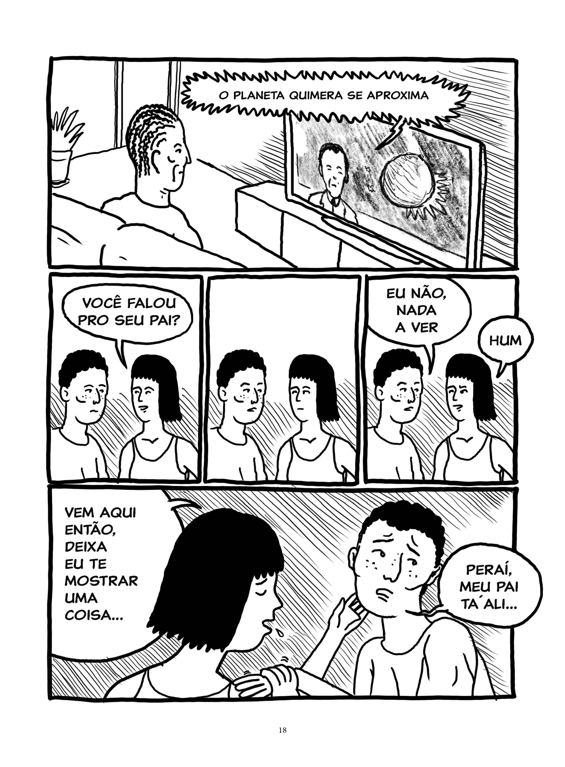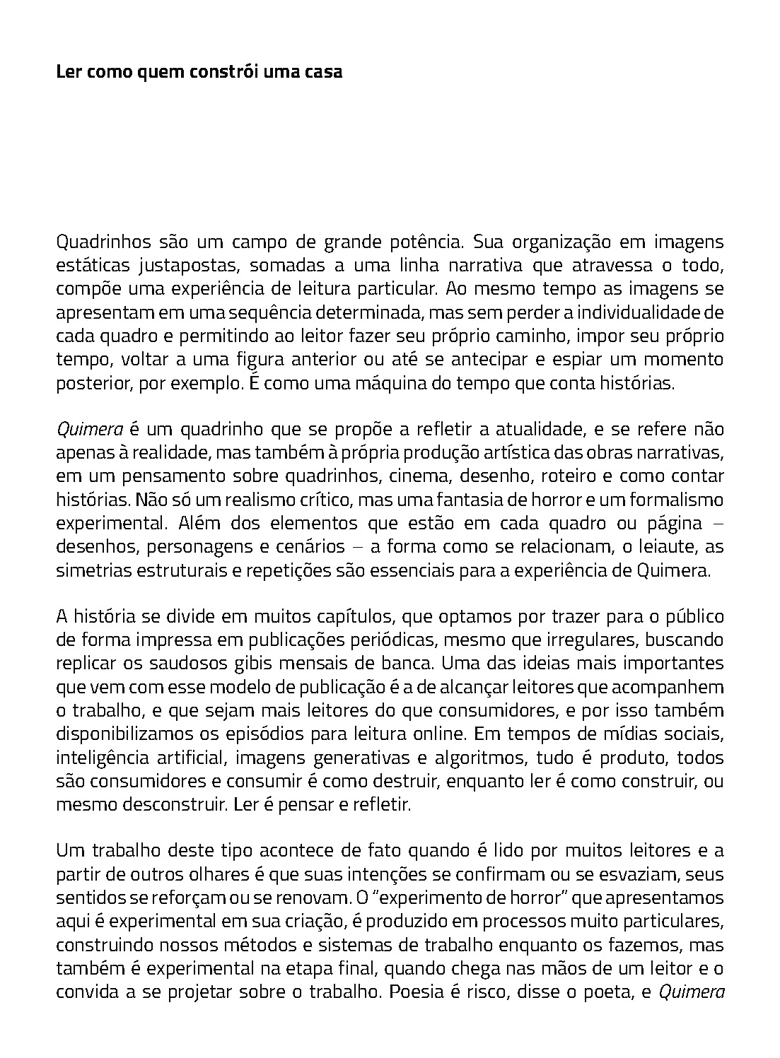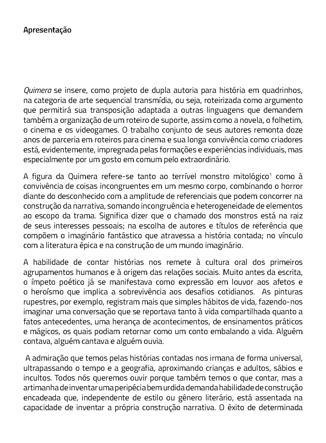 Os quadrinhos constituem a primeira versão da história, planejada para contar um grande arco de horror-cósmico. Desde 2024, Quimera vem sendo publicada de forma seriada, como os antigos gibis de banca. Com uma linguagem experimental, Quimera compõe uma reflexão profunda sobre quadrinhos, cinema e horror.