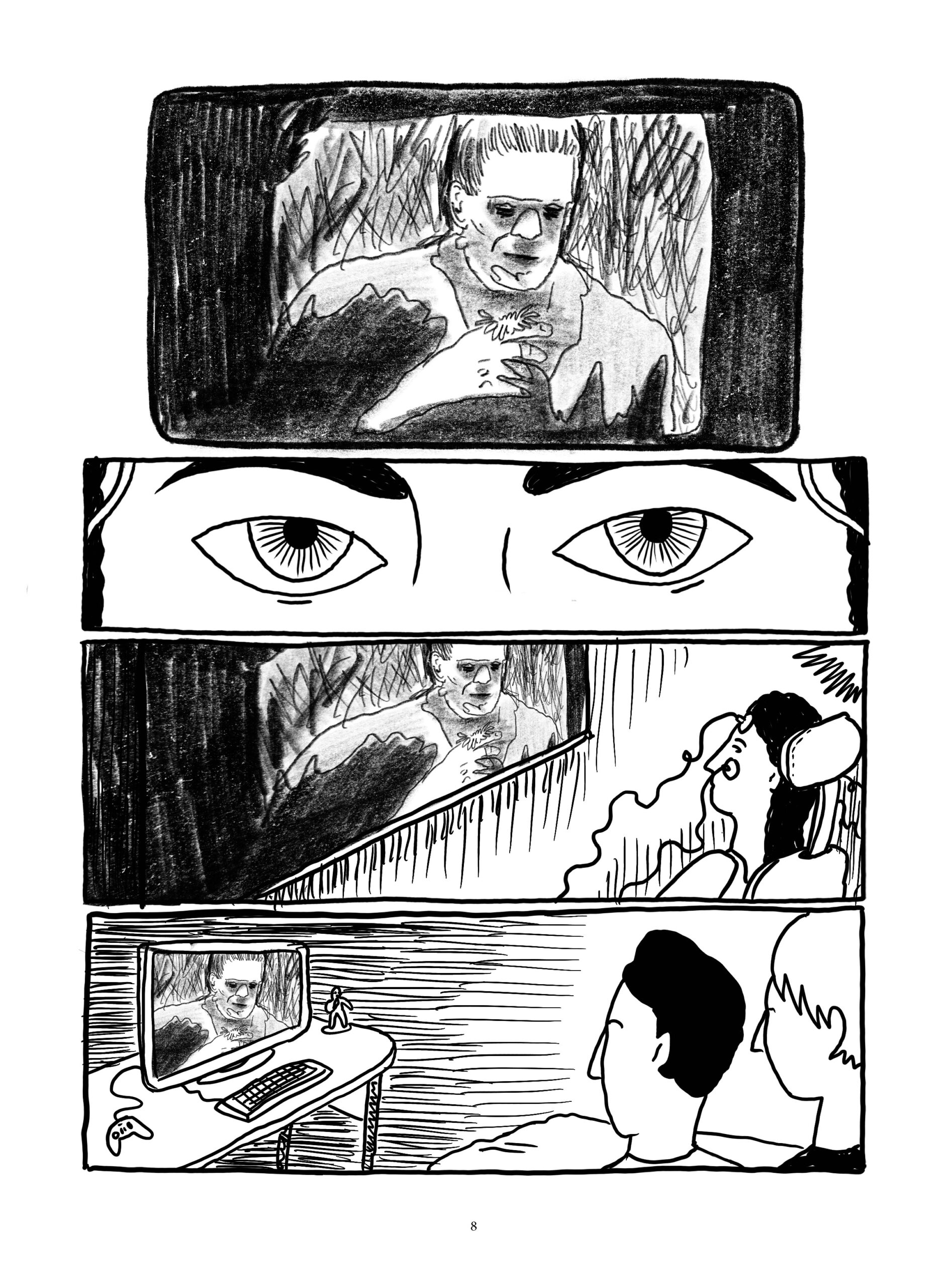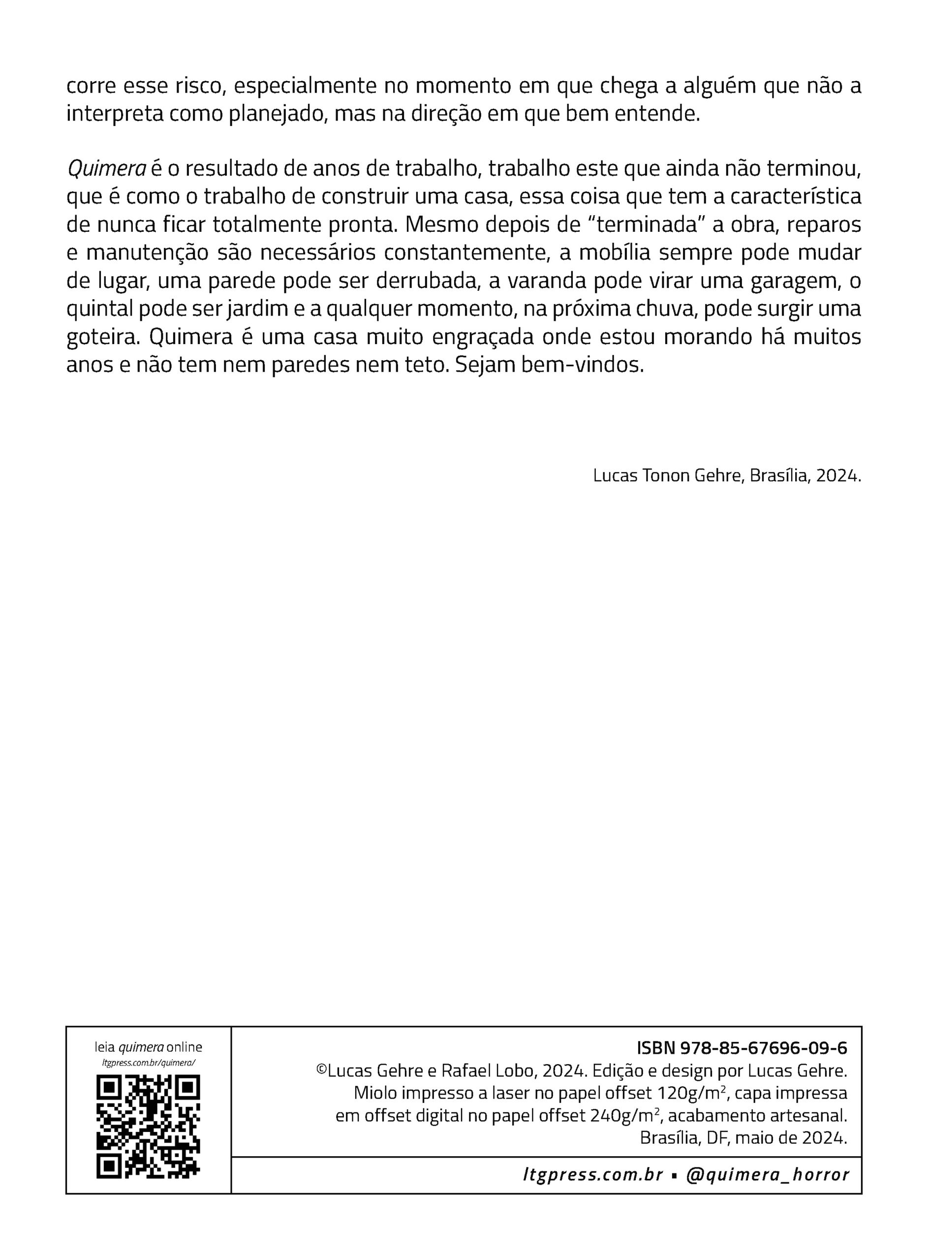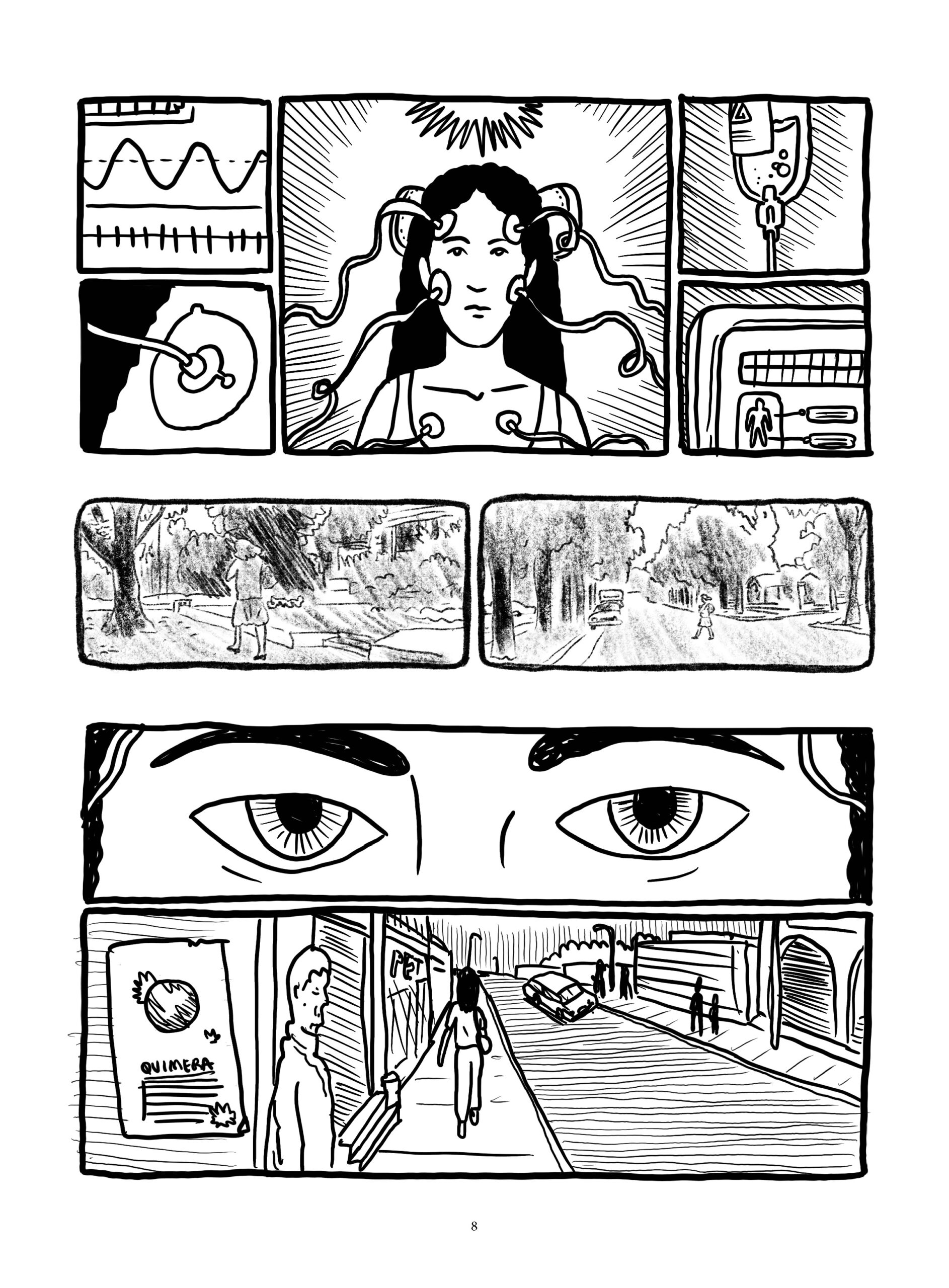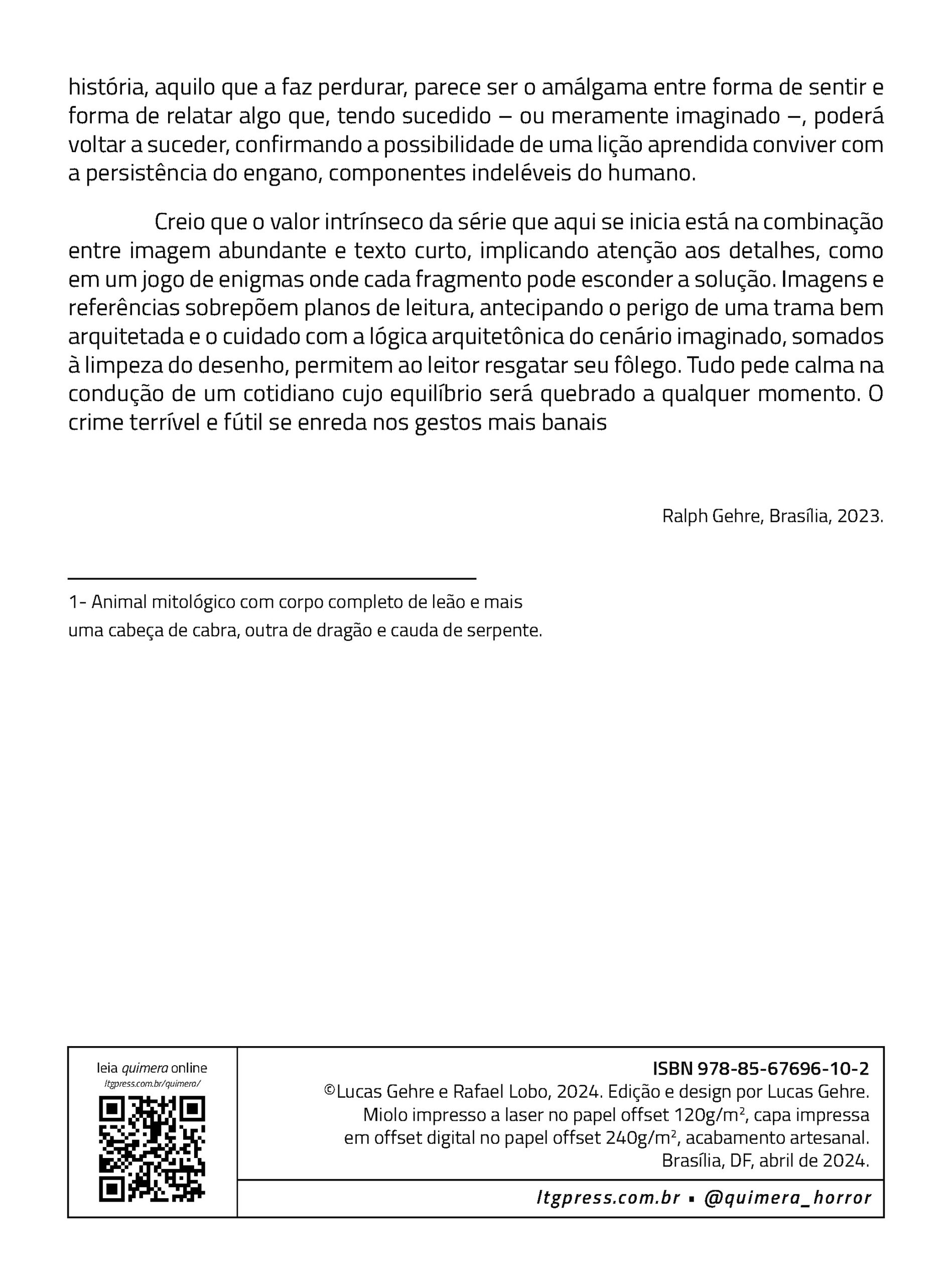 Os quadrinhos constituem a primeira versão da história, planejada para contar um grande arco de horror-cósmico. Desde 2024, Quimera vem sendo publicada de forma seriada, como os antigos gibis de banca. Com uma linguagem experimental, Quimera compõe uma reflexão profunda sobre quadrinhos, cinema e horror.
