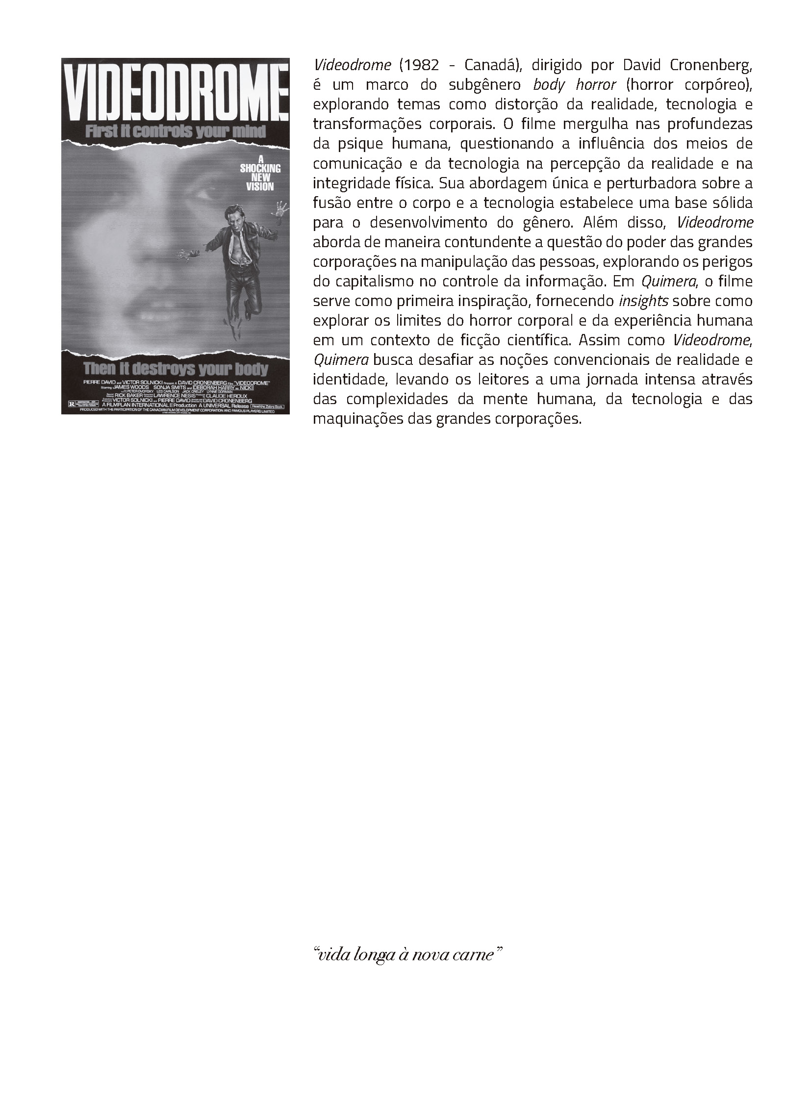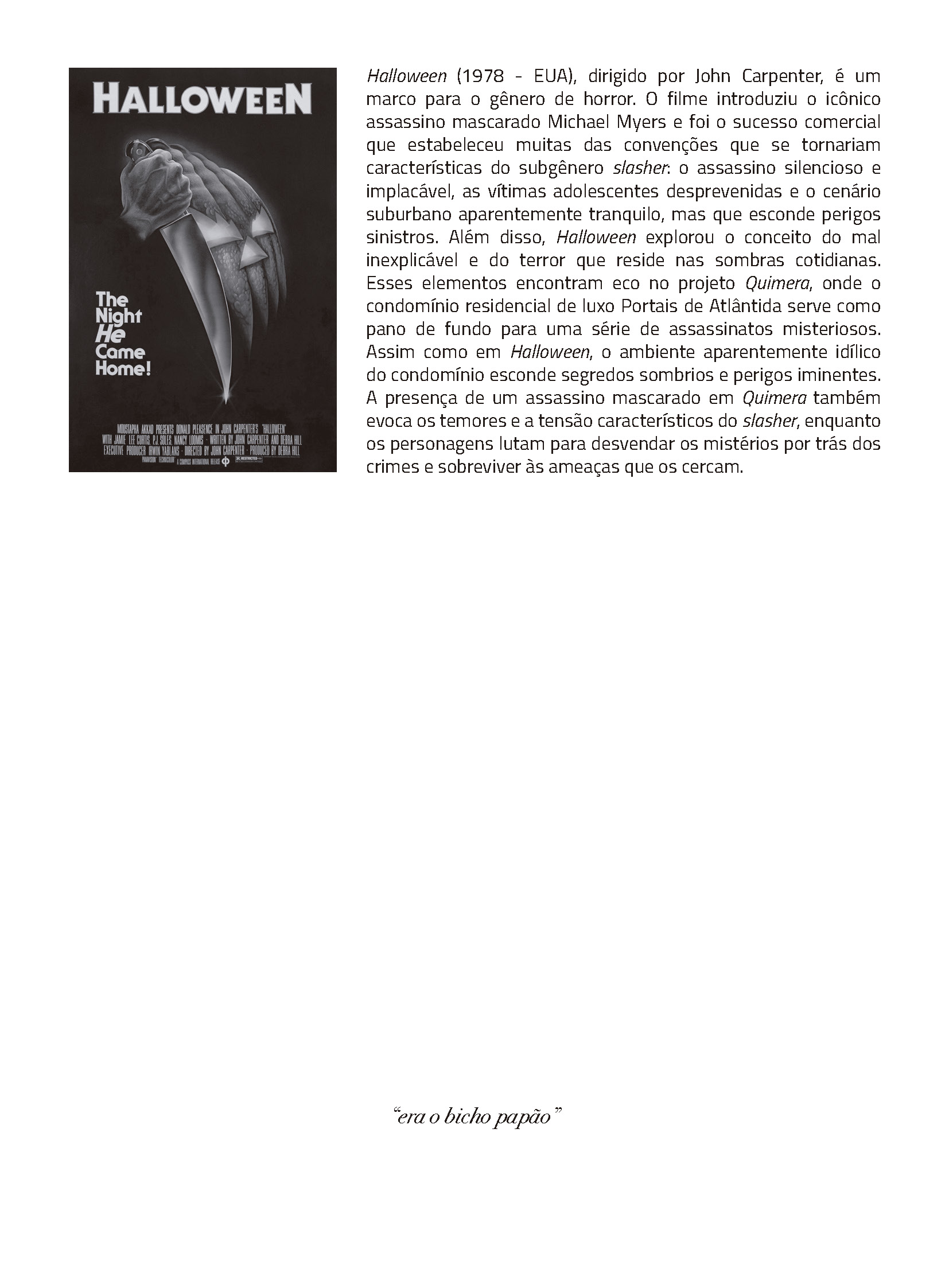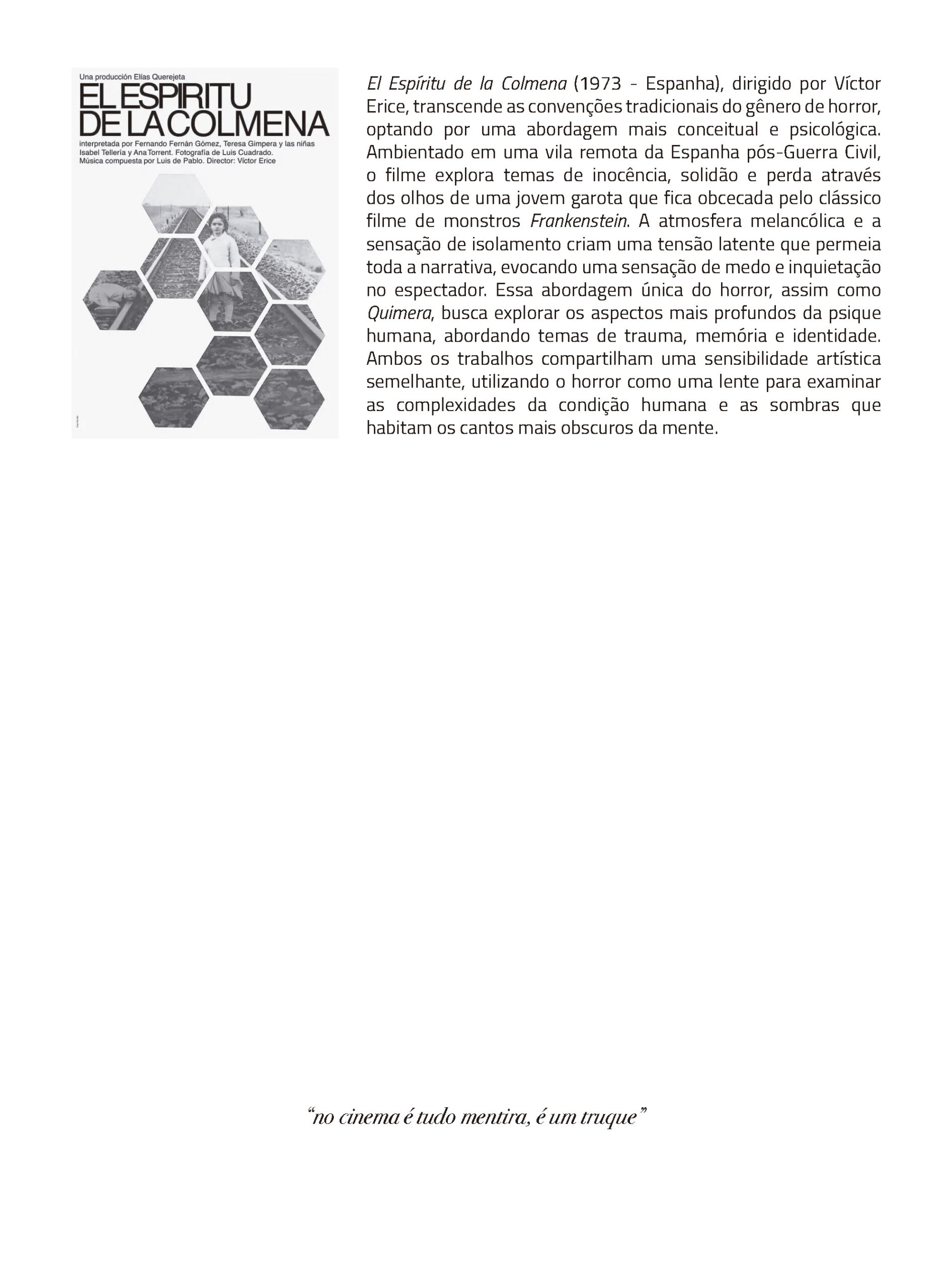 Cada episódio dos quadrinhos de Quimera se relaciona a um filme de horror, que também aparece dentro da história associado ao experimento científico de um jeito estranho e obscuro. As obras de referência contaminam a narrativa, o desenho e o ritmo, somando-se na história tecendo um discurso sobre o gênero do horror.
